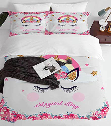 HB.YE Single Bedding Set Duvet Cover Pillowcase for Children Bedroom, Licorne Quilt for Girl Boy - Unicorn Rose