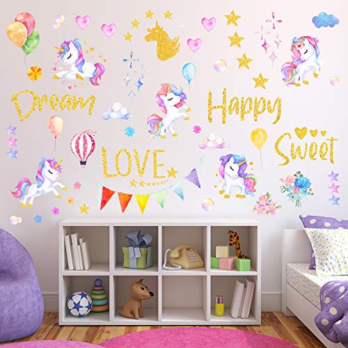 Dreamy unicorn pattern: unicorn wall decals contain the elements of unicorns, rainbow, stars, balloons, cloud and other cute patterns in watercolor style, creating a strong sense of beauty and loveliness to girl’s bedroom, establishing a lovely environment for you to enjoy